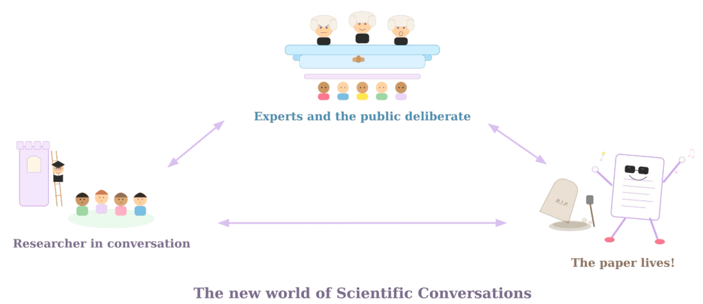 But the point of Scientific Conversations is not adversarial, but to recognize mistakes, uncertainty, and context as a natural part of the scientific process. The goal is dialogue. Papers could have multiple editions, with credit given to those who extend or improve them. The research endeavour, refocused onto conversations and away from papers should incentivise a more dynamic, truthful form of science.